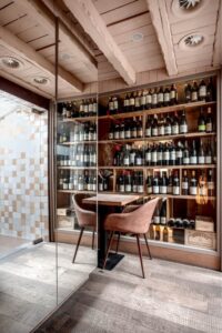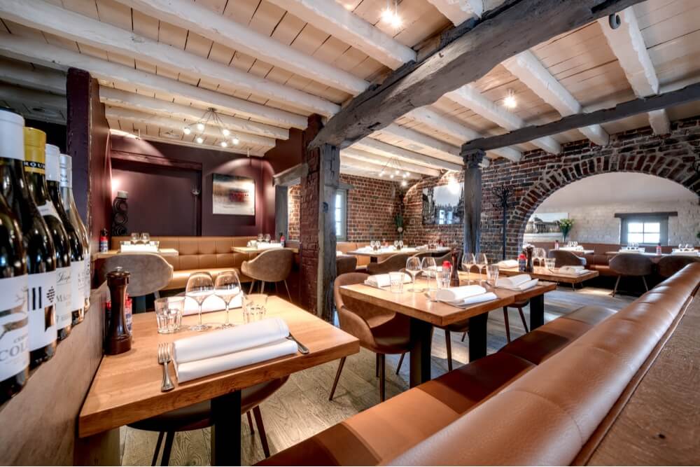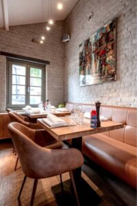 A l’intérieur, l’esprit fermette est resté, avec les briques et les poutres apparentes. Mais la décoration est volontairement épurée et l’éclairage soigné pour créer une atmosphère plus moderne et dégager la vue sur la cuisine ouverte.