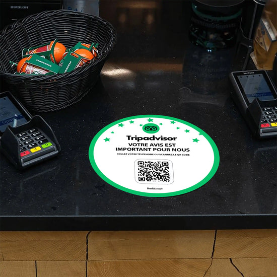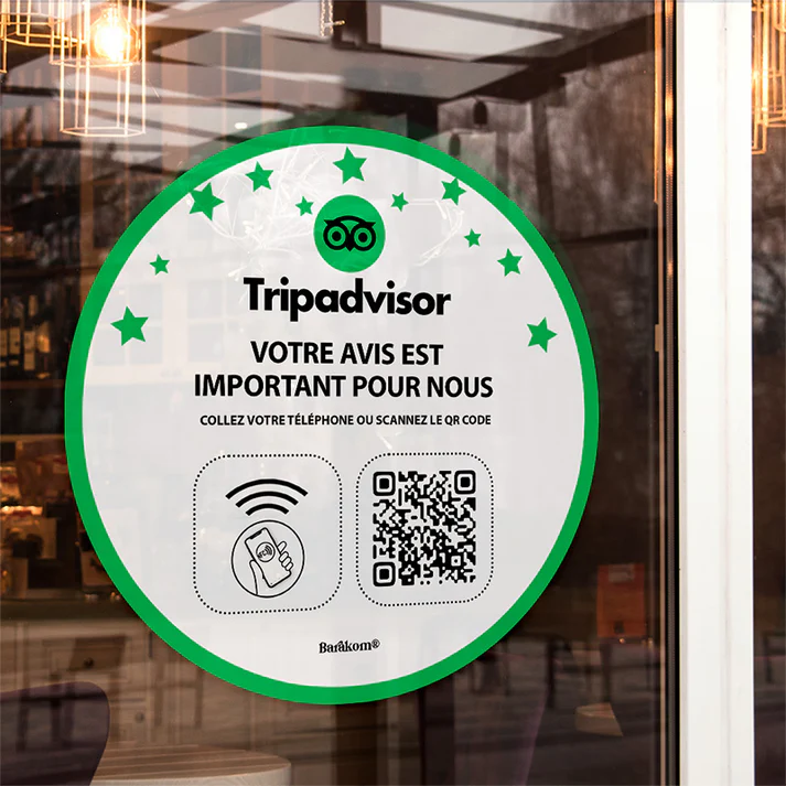 Autocollant NFC TripAdvisor permettant à vos clients de laisser un avis TripAdvisor en quelques secondes, simplement en approchant leur smartphone ou en scannant le QR Code. Sans application ni recherche, il se colle facilement sur une vitrine, un comptoir, une caisse ou une table. Discret et efficace, cet autocollant est idéal pour développer votre réputation en ligne, notamment auprès des touristes et clients de passage, et renforcer la crédibilité de votre établissement.