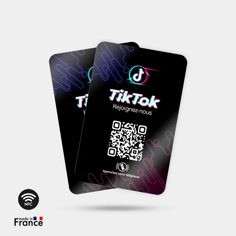 Carte de visite NFC TikTok permettant à vos clients d’accéder instantanément à votre compte TikTok et de découvrir vos vidéos en un seul geste. Un simple contact avec le smartphone ou un scan du QR Code suffit, sans application ni recherche. Moderne et originale, cette carte remplace la carte de visite classique et devient un outil puissant pour gagner en visibilité, attirer de nouveaux abonnés et mettre en avant l’ambiance de votre établissement.