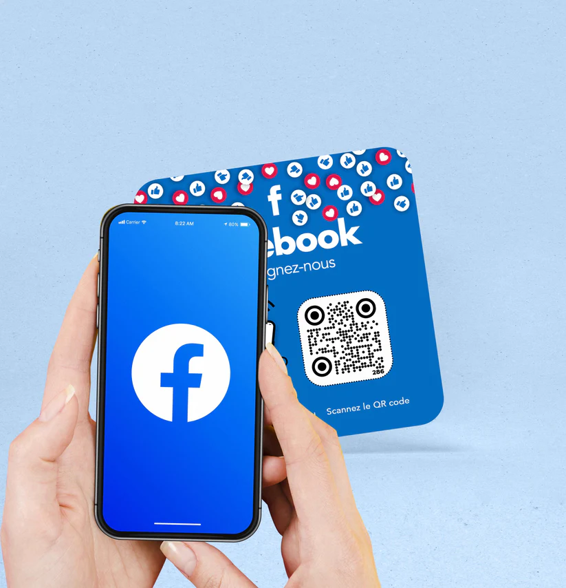 Plaque NFC & QR Code Facebook permettant à vos clients d’accéder instantanément à votre page Facebook professionnelle : aimer la page, consulter vos publications, événements ou informations pratiques. Un simple geste suffit, sans recherche ni application. Idéale pour restaurants et commerces souhaitant développer leur communauté, améliorer leur visibilité locale et rester connectés avec leurs clients.