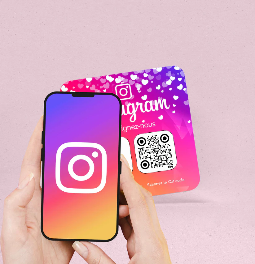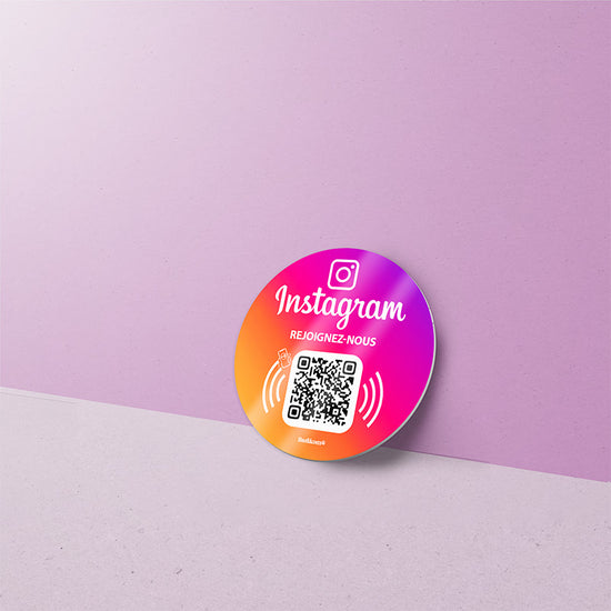 Plaque NFC & QR Code Instagram permettant à vos clients de vous suivre sur Instagram en un seul geste, sans recherche ni application. Il suffit d’approcher le smartphone ou de scanner le QR Code pour accéder directement à votre compte. À placer sur un comptoir, une table ou une vitrine, cette plaque est idéale pour augmenter rapidement vos abonnés, renforcer votre image et développer votre visibilité sur Instagram.